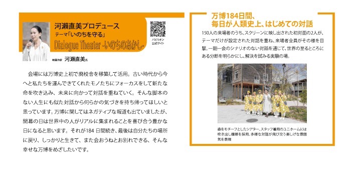 会場には万博史上初で廃校舎を移築して活用。古い時代から今へと私たちを運んできてくれたモノたちにフォーカスをして新たな命を吹き込み、未来に向かって対話を重ねていく。そんな脚本のない人生にも似た対話から何らかの気づきを持ち帰ってほしいと思っています。万博に関してはネガティブな報道も出ていましたが、開幕の日は世界中の人がリアルに集まれることを喜び合う豊かな日になると思います。それが184日間続き、最後は自分たちの場所に戻り、しっかりと生きて、また会おうねとお別れできる、そんな幸せな万博をめざしたいです。