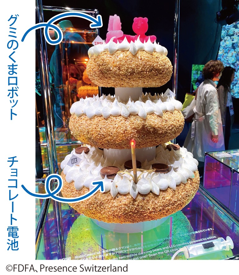 スイスパビリオンでは「RoboFood(ロボフード)」として、食品工学とロボット工学を融合させた、食べられるロボットとロボットのような食品をつくりだす世界初のプロジェクトに挑戦。食用チョコレート電池や踊るグミのくまロボットを展示。組み合わせると未来には、災害時に派遣した救助ロボット自体が食料として活用できるとか。 ※全て展示品なので、食べることはできません