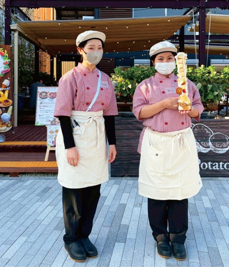 さつまいもスイーツ専門店らぽっぽは未来型SDGsカフェを展開。敷地内のコンテナで栽培されるおいも畑を眺めながら色々なメニューを楽しめる。目玉は40㎝もの高さがある「おいもといちごとりんごのプレミアムツリーパフェ」。スイーツメニューのほかにも安納芋を食べて育った国産黒豚のベーコンや生ハムをトッピングしたピザなど食事メニューもスタンバイ。