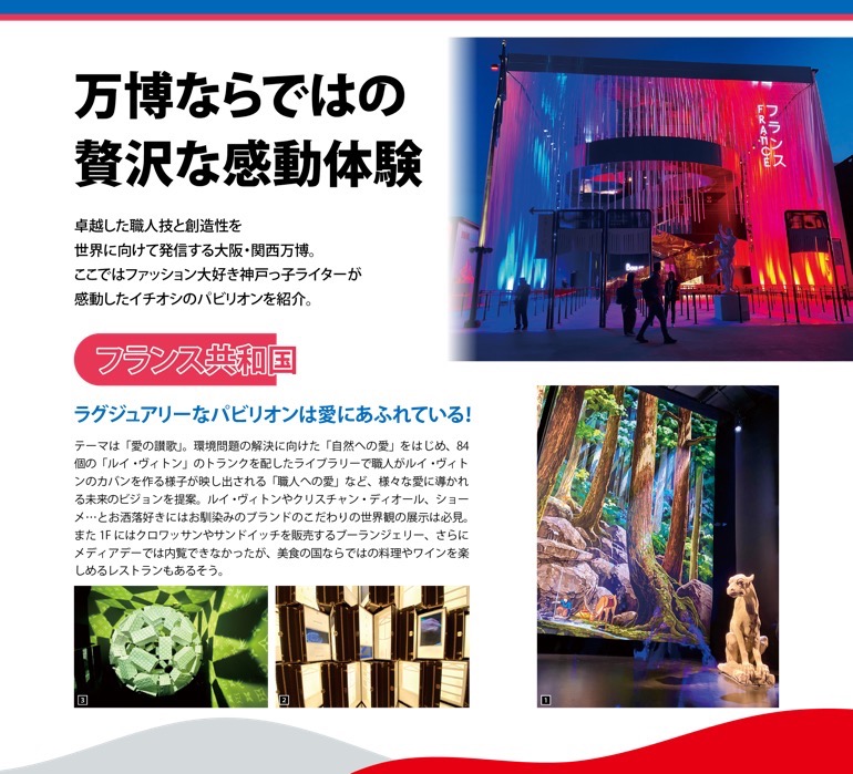 テーマは「愛の讃歌」。環境問題の解決に向けた「自然への愛」をはじめ、84個の「ルイ・ヴィトン」のトランクを配したライブラリーで職人がルイ・ヴィトンのカバンを作る様子が映し出される「職人への愛」など、様々な愛に導かれる未来のビジョンを提案。ルイ・ヴィトンやクリスチャン・ディオール、ショーメ…とお洒落好きにはお馴染みのブランドのこだわりの世界観の展示は必見。また1Fにはクロワッサンやサンドイッチを販売するブーランジェリー、さらにメディアデーでは内覧できなかったが、美食の国ならではの料理やワインを楽しめるレストランもあるそう。